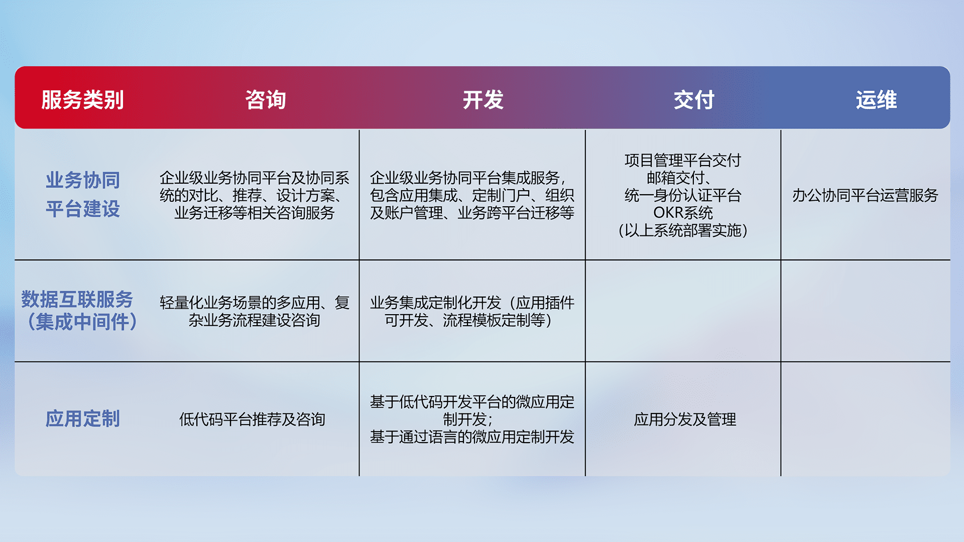 针对钉钉、、企微、、、IDaas等平台级产品提供产品的规划、、方案、、、、交付、、、定制化开发等服务,,,实现如统一协同办公、、智能客户服务、、、混合会议管理、、、、智能数据查询、、、、等业务场景,,实现数字化转型。。