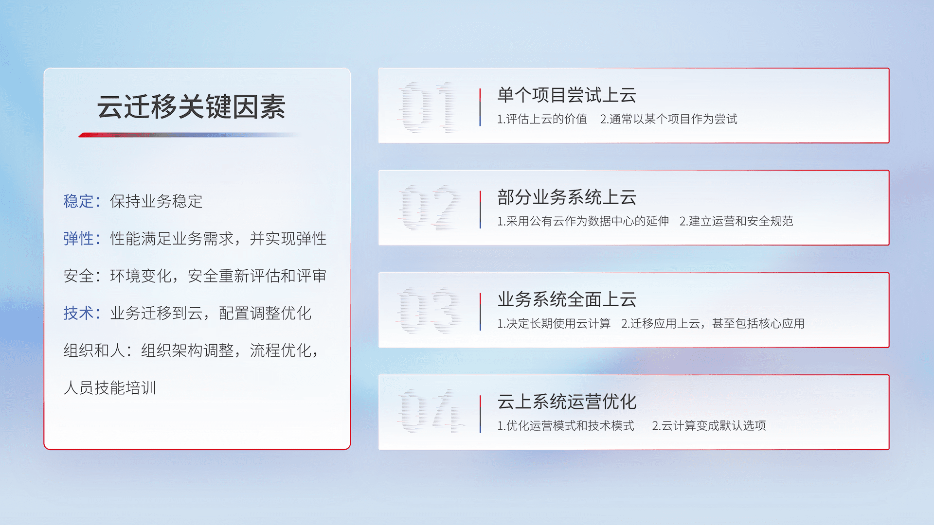 结合实际业务,,,,从规划设计、、、、云平台选型、、、、云原生改造、、、数据迁移、、、集成交付,,迁移全过程为客户识别最佳上云路径,,做好风险识别管理,,,,设计网络架构、、身份权限、、、安全审计合规、、操作审计、、、、日志审计、、监控告警策略、、、、多站点容灾设计等,,对云上基础设施进行整体规划,,提升IT治理水平,,以满足弹性、、、、高可用、、、高性能的需求。。。