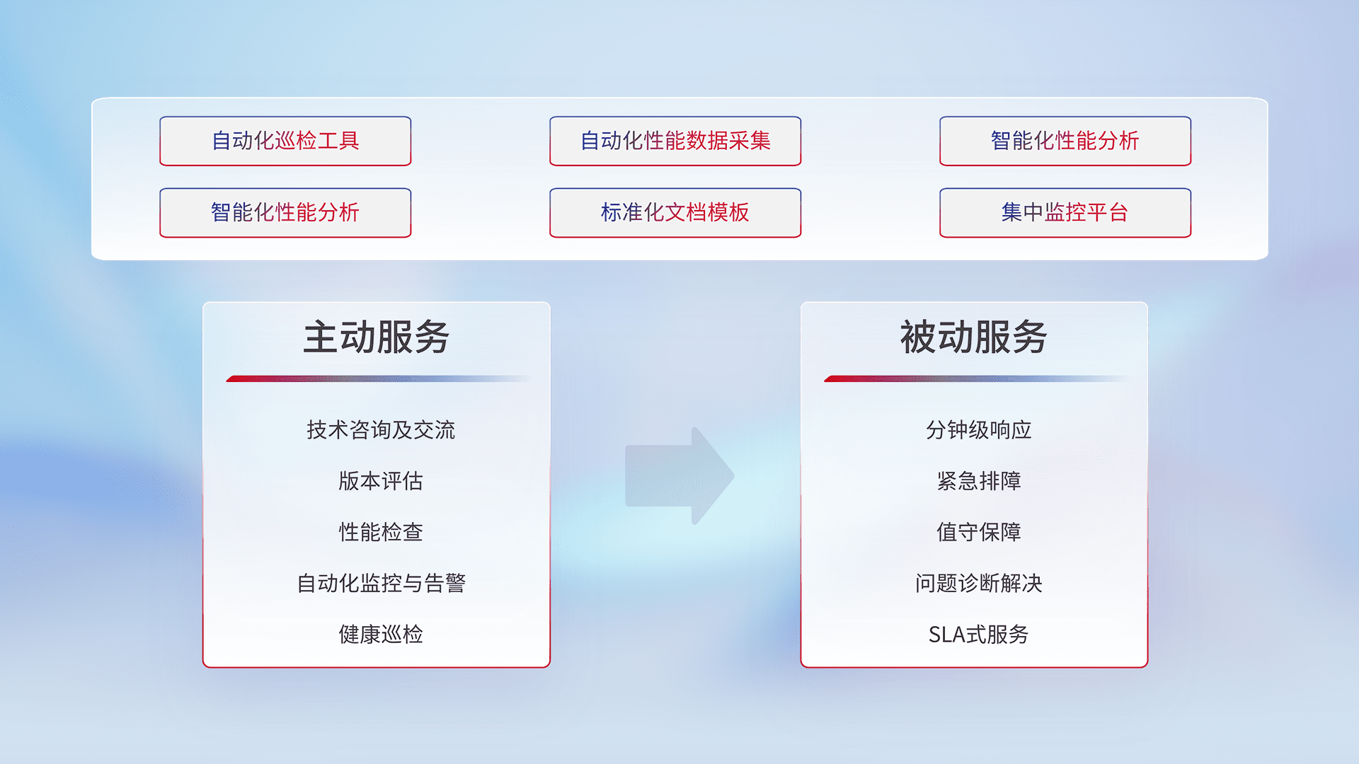 智能化工具和标准化文档,,,保障服务质量,,,,提供主动服务(包含技术咨询、、、、版本评估、、、性能检查、、、、自动化监控与告警、、、、健康巡检)和被动服务包含(分钟级响应、、、、紧急排障、、值守保障、、、、问题诊断解决、、SLA服务)。。。
